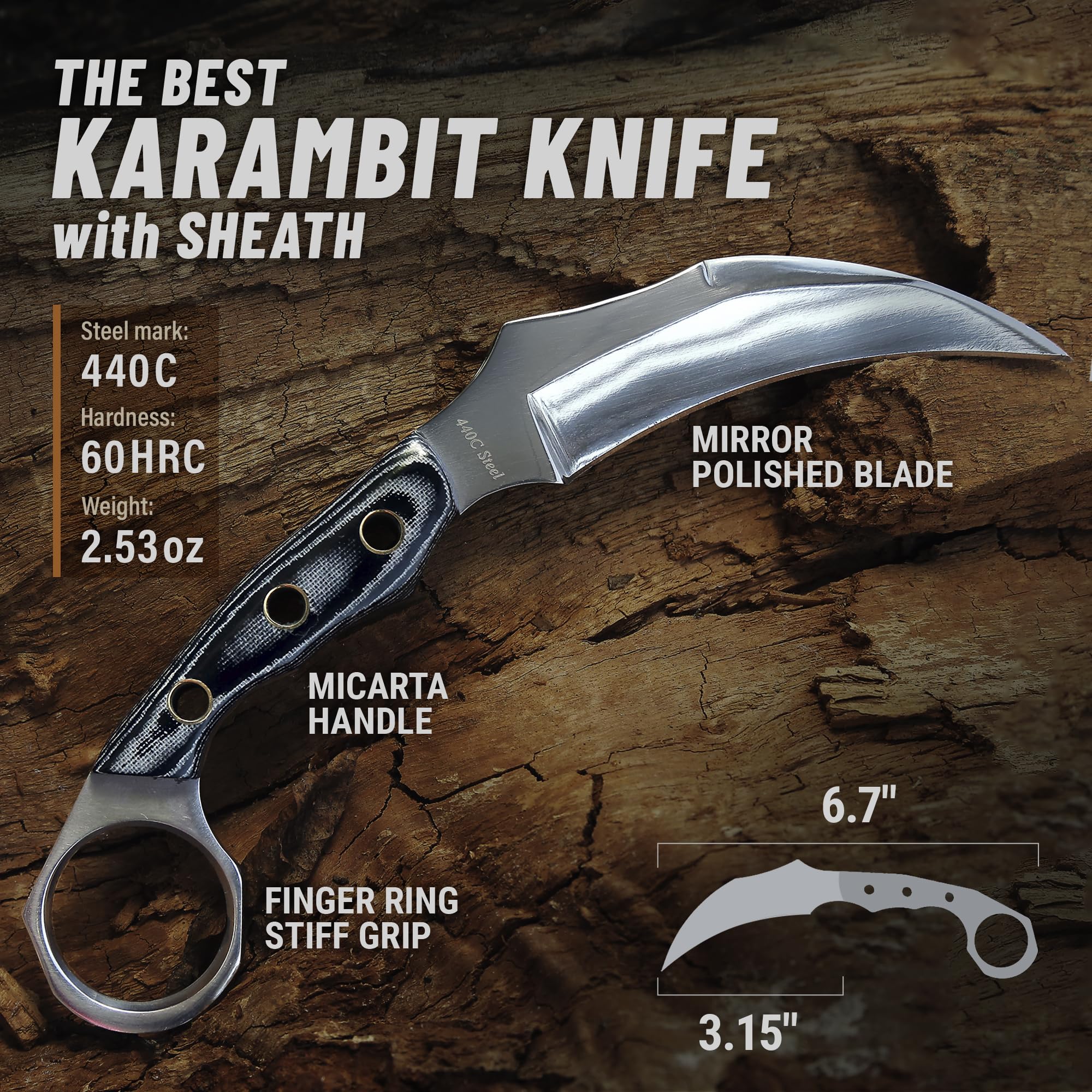 6.7'' Tactical Knife with Sheath - Micarta Handle - 3.15'' Fixed Mirror Polished Blade - Sharp Tiger Claw4 40C Steel Blade - Small Knives for Camping Hunting Survival EDC for Men and Women 2534