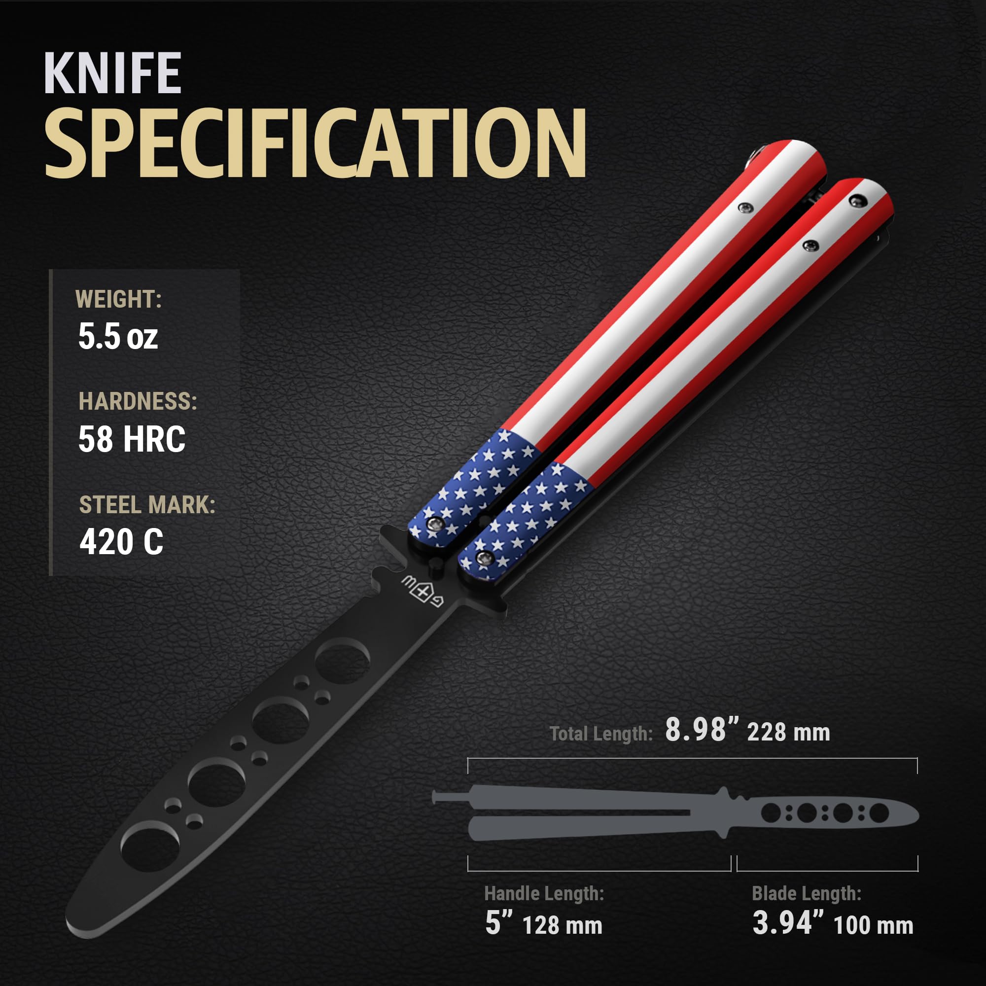 - AMERICAN BUTTERFLY KNIFE is made of 420C stainless steel (58 HRC) with reinforced screws & pins, providing a reliable training experience. Lock type - spring latch; Blade length - 3.94"; Handle length - 5.04"; Overall length - 8.98"; Weight - 5.5 OZ.