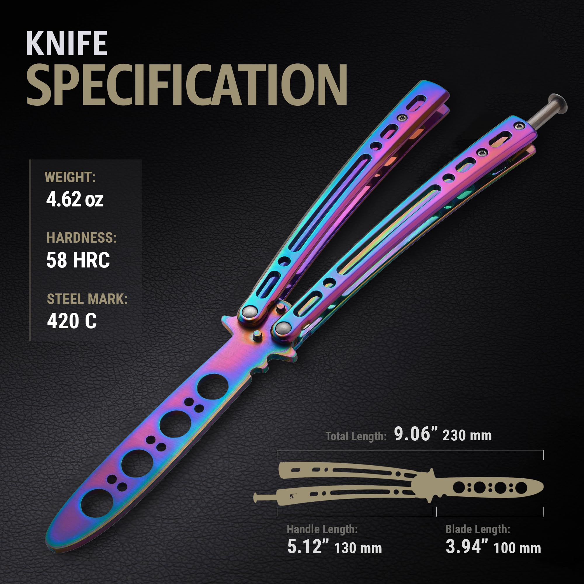 - MULTICOLOR BUTTERFLY KNIFE is made of 420C stainless steel (58 HRC) with reinforced screws & pins, providing a reliable training experience. Lock type - spring latch; Blade length - 3.94"; Handle length - 5.12"; Overall length - 9.06"; Weight - 4.62 OZ.