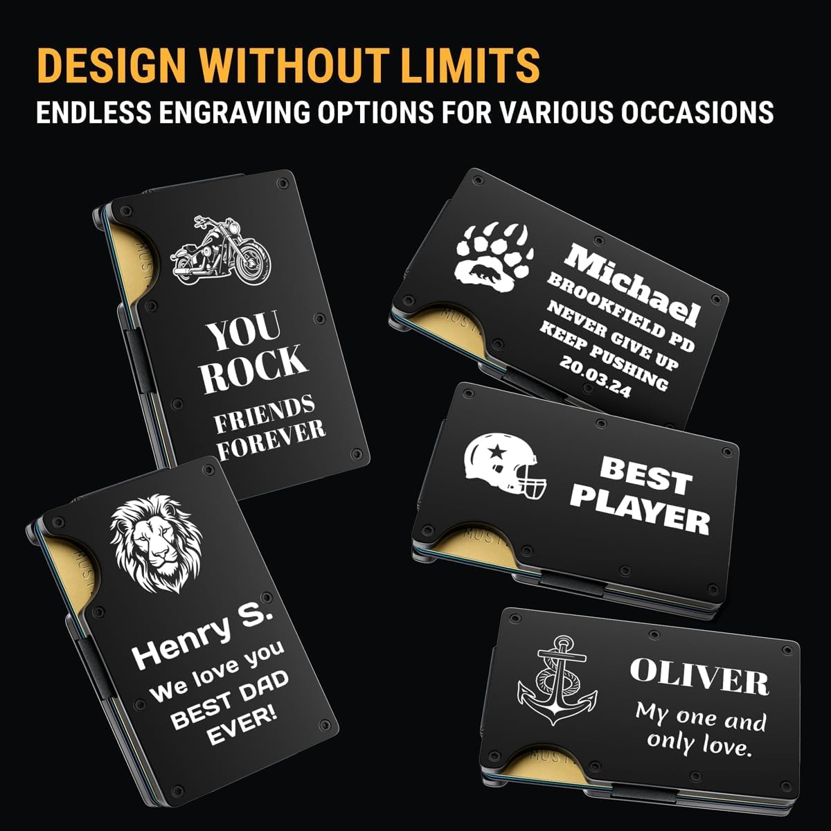 - CUSTOM ENGRAVED WALLET FOR MEN: A durable metal wallet combining function and personalization. Customize this minimalist wallet with our engraving options by adding a name, special message, icons, along with additional items. This wallet not only serves as a reliable cardholder but also as a lasting keepsake, making it an ideal gift for any occasion;