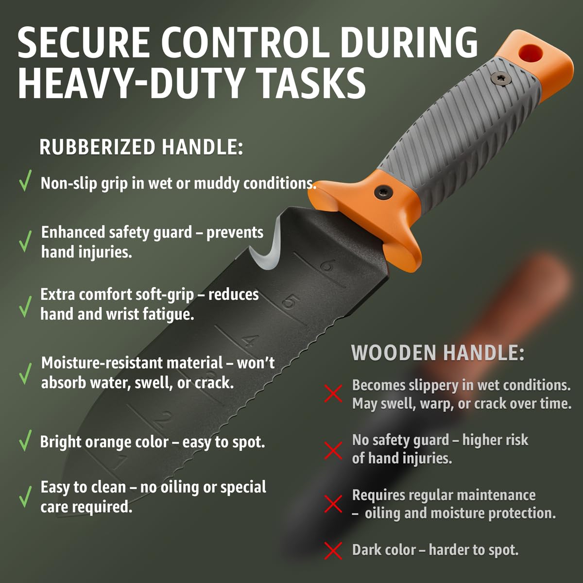 - Non-Slip Rubberized Handle (Better Than Wood). Ergonomic plastic handle with rubber coating provides superior grip even in wet or muddy conditions. Won’t crack, absorb moisture, or become slippery like traditional wooden handles.