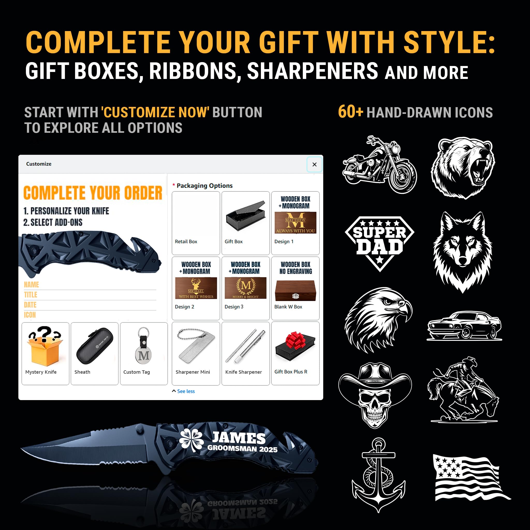 - FREE ENGRAVING – Click CUSTOMIZE NOW to explore multiple stylish fonts and personalize with initials, a meaningful date, or short text. Your custom pocket knife will be both practical and memorable – a keepsake your groomsman will value for years.