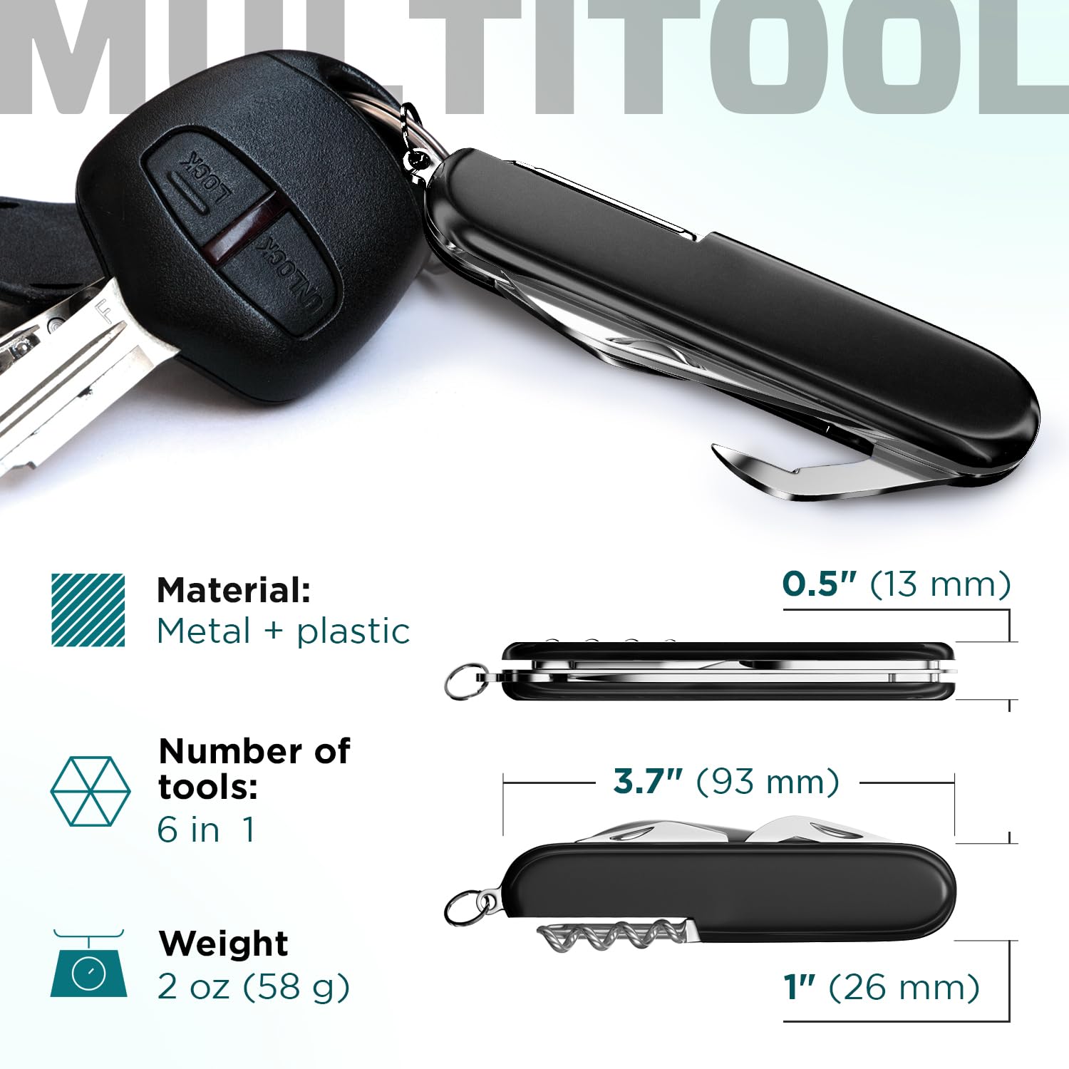- 6-IN-1 MINI KNIFE: This mini keychain knife packs 6 essential tools in one sleek design: sharp blade, bottle opener, can opener, Phillips screwdriver, corkscrew, and key holder. Compact enough to carry everywhere, tough enough for daily use.